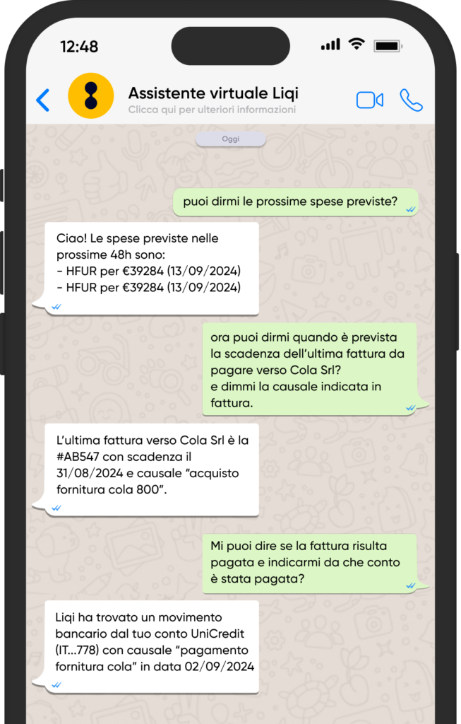 L’assistente virtuale di Liqi: la tua guida finanziaria, disponibile 24/7! Chiedigli qualsiasi cosa, dall’analisi di fatturato e costi a consigli personalizzati per aumentare le tue vendite. Disponibile sia da web che direttamente su WhatsApp!